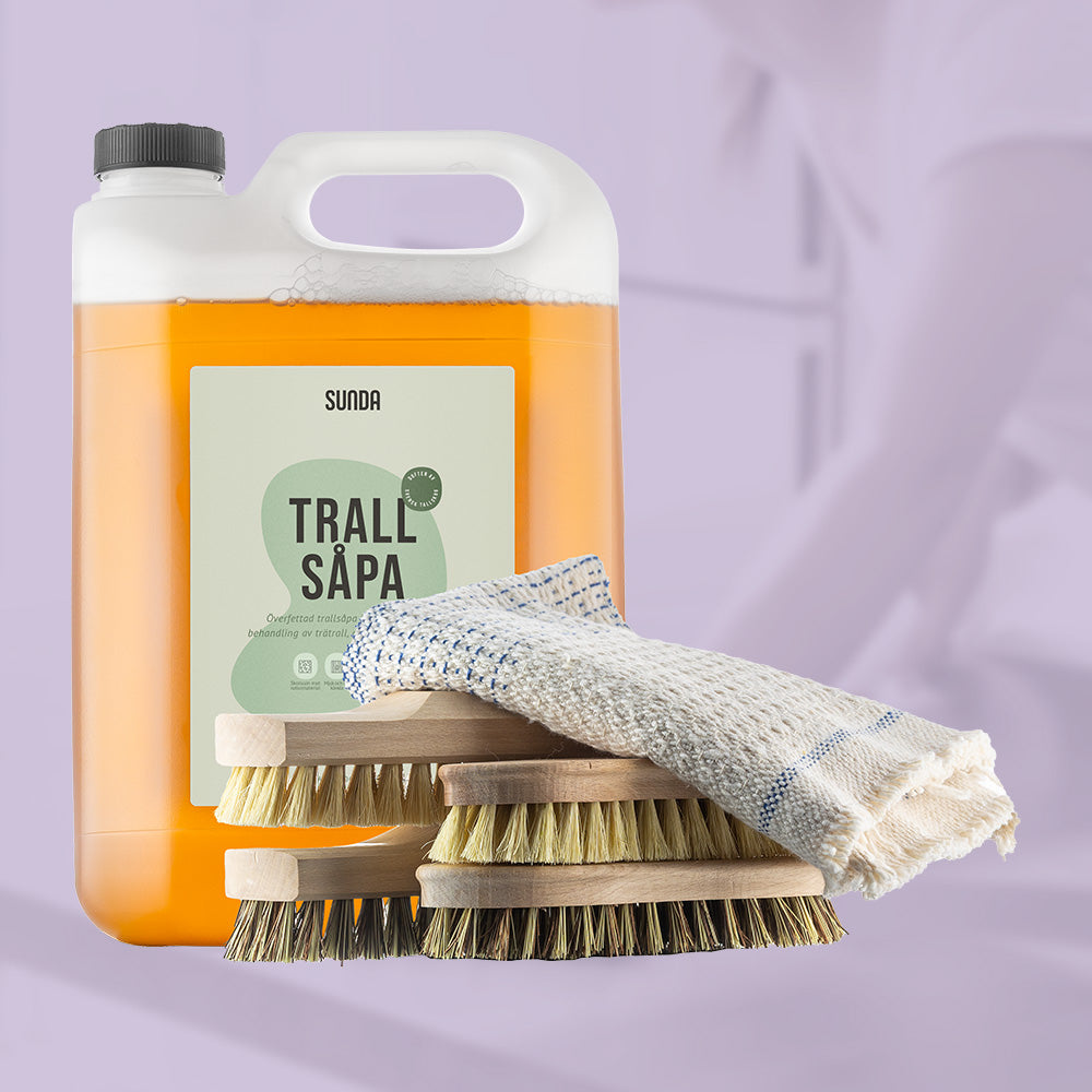 Trallsåpa är en överfettad såpa som drar nytta av de naturliga egenskaperna från naturen och rengör och behandlar trätrall och andra träytor skonsamt. Skyddar mot torrsprickor och återfettar ytan så trät får en mjuk och varm känsla.